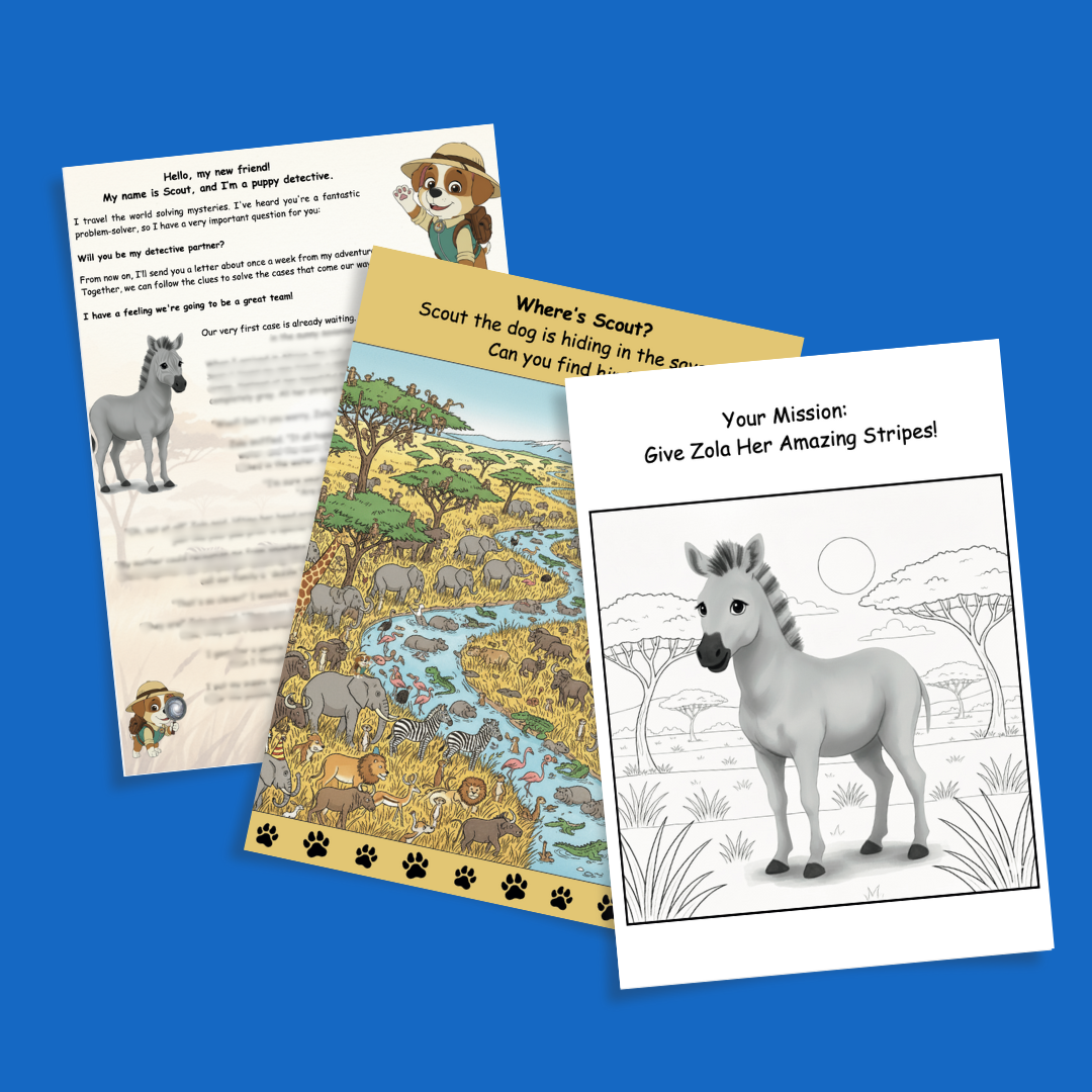 Each month, your child receives three mailed letters from Scout the detective puppy. Every envelope is packed with fun stories, activities, and challenges that connect to the adventure.